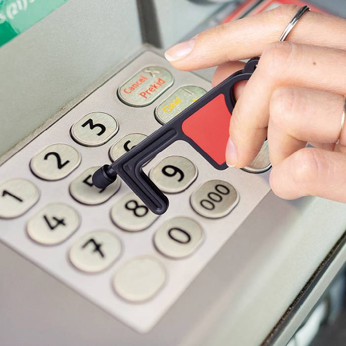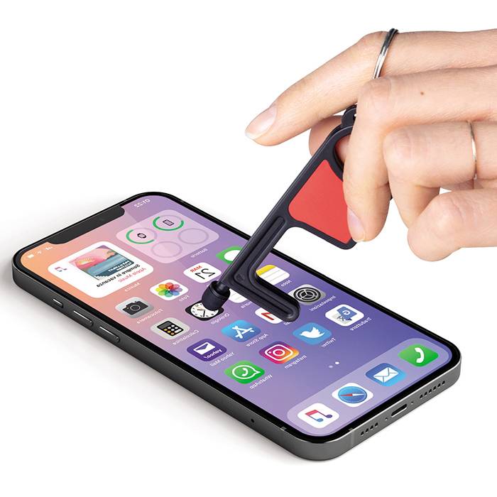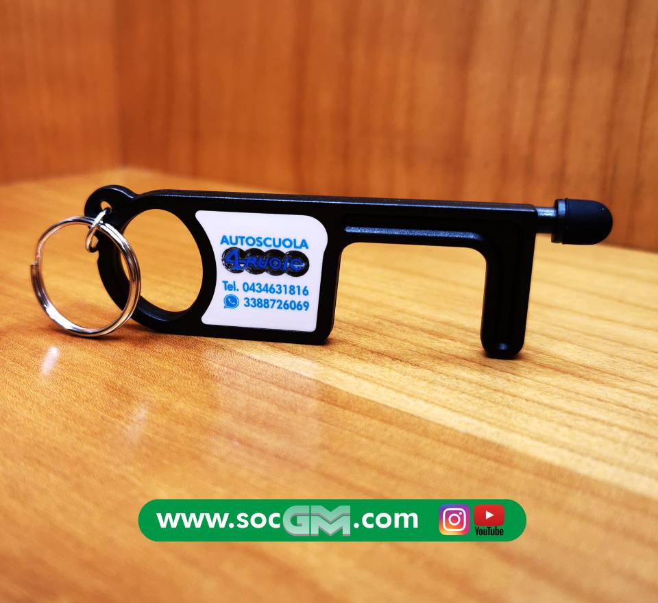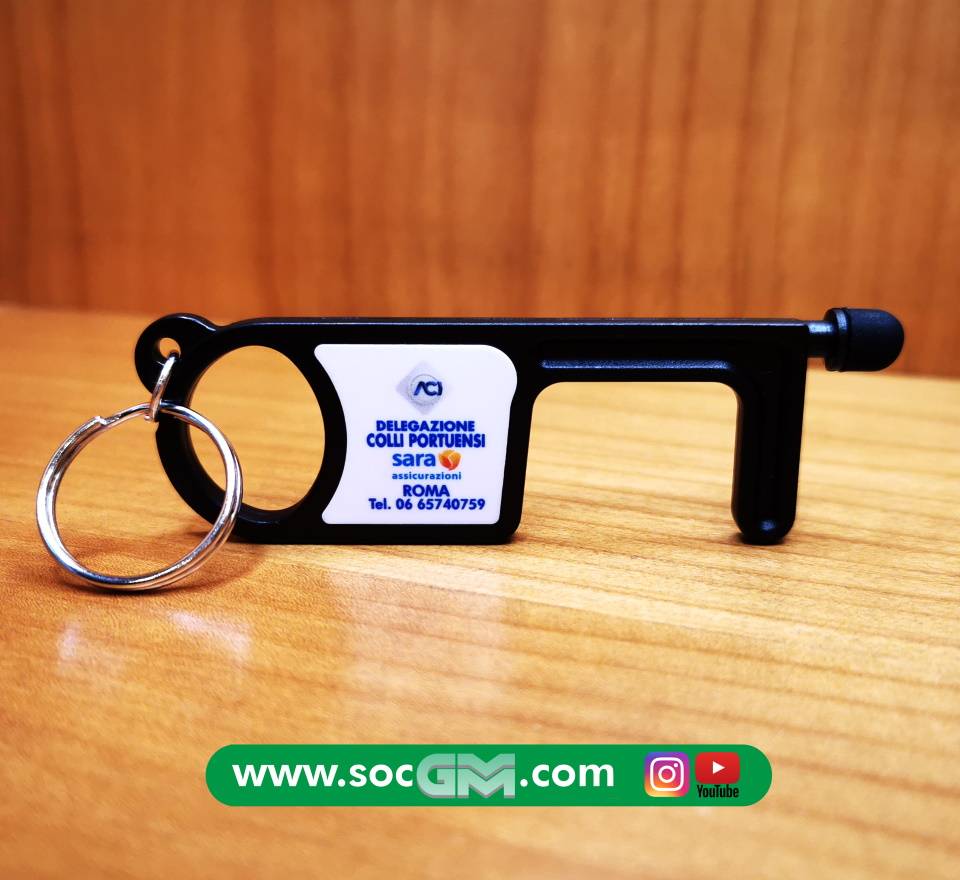 Porta chiavi anti contatto, igienico, progettato per evitare di toccare superfici di uso comune come maniglie, tastiere bancomat, ecc, con comoda impugnatura per il dito, puntatore per superfici touch screen , personalizzabile con stampa a colori!
