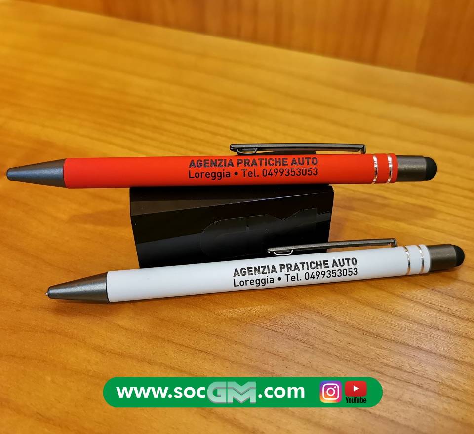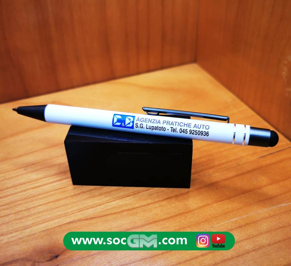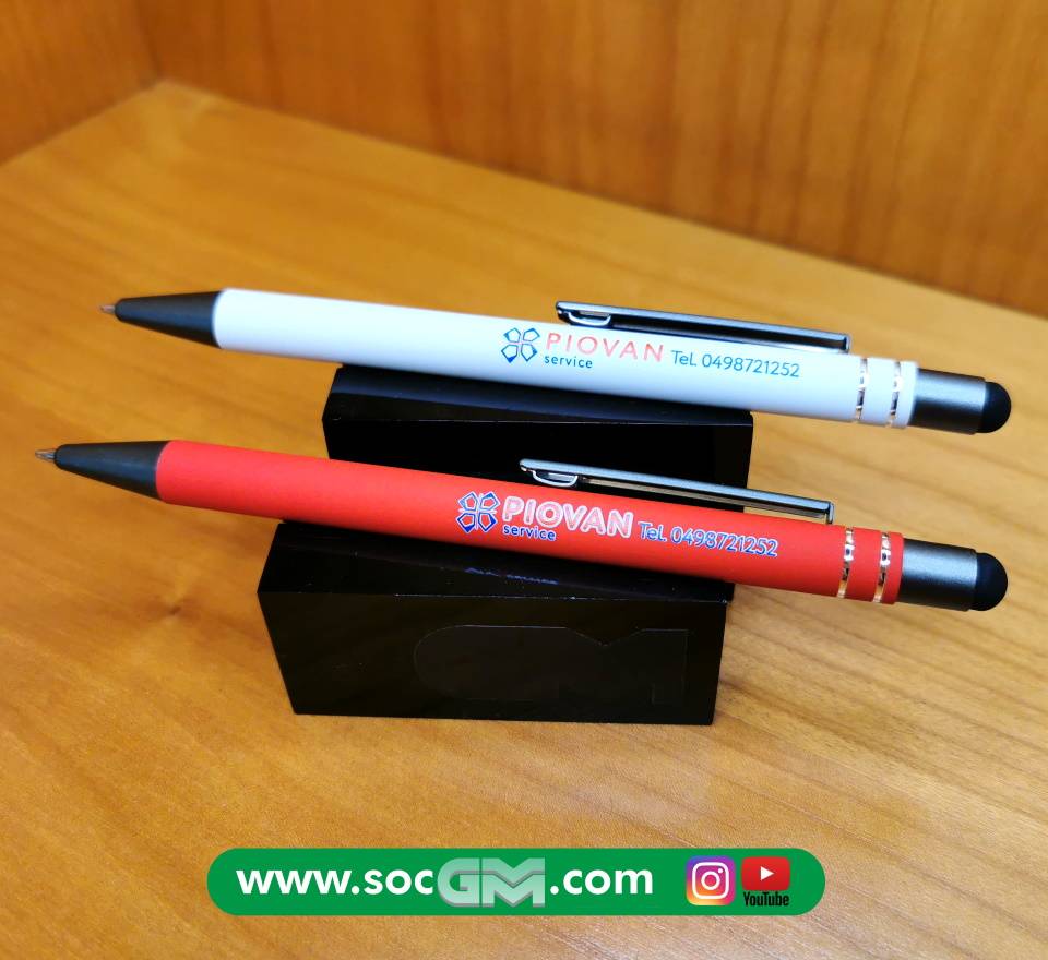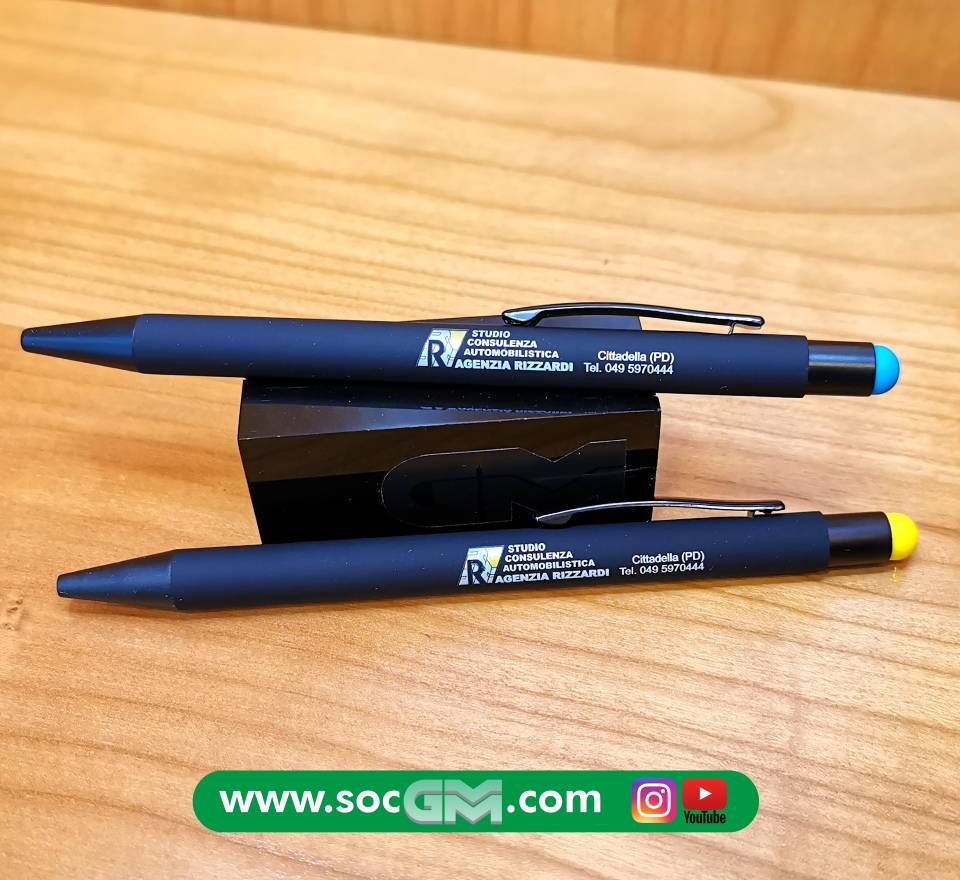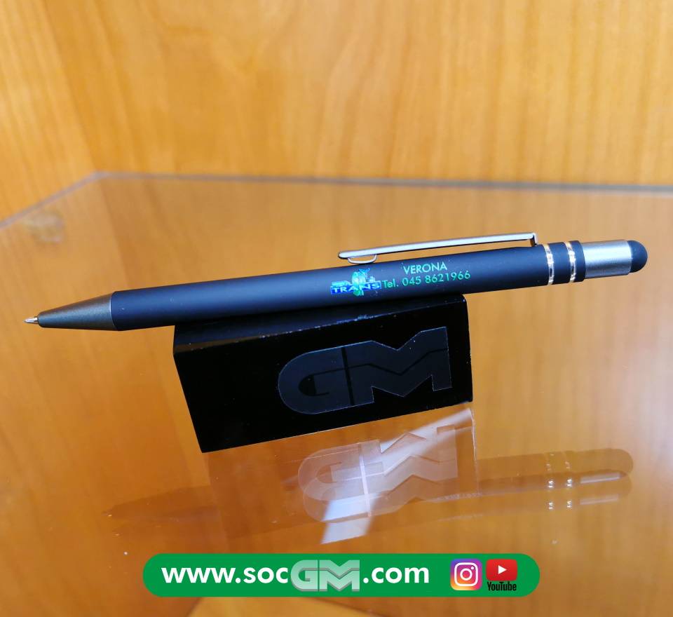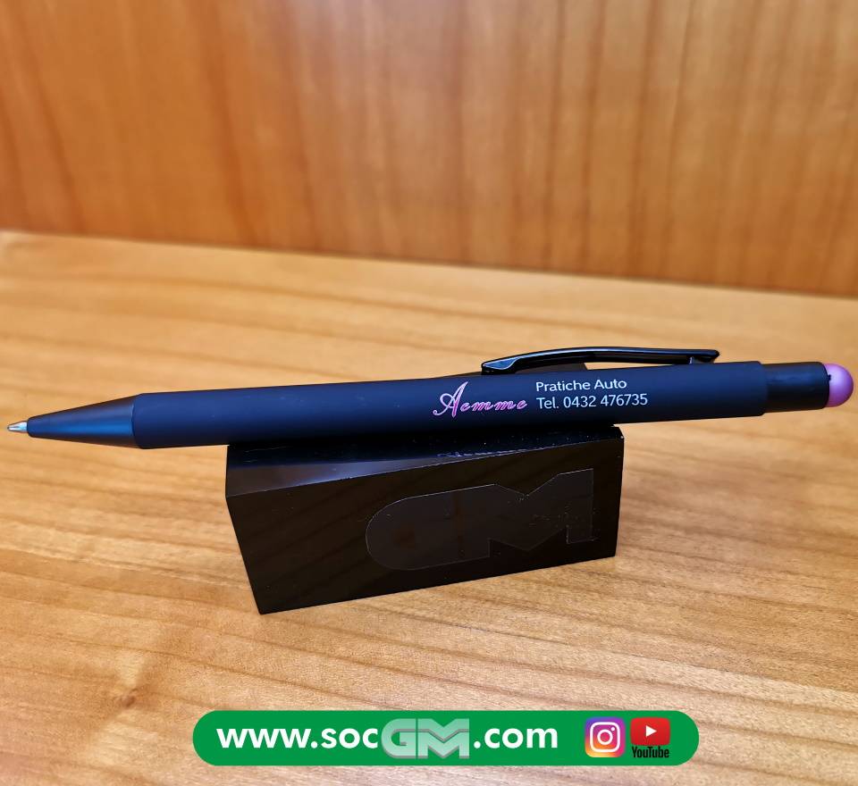 Elegante penna in soft touch con gommino per superfici touch screen, inserti in metallo, refill jumbo, con possibilità di stampa A COLORI sul fusto del proprio logo aziendale.
