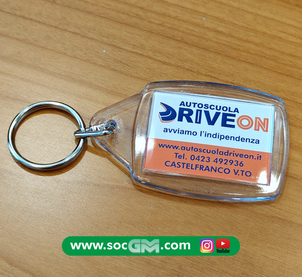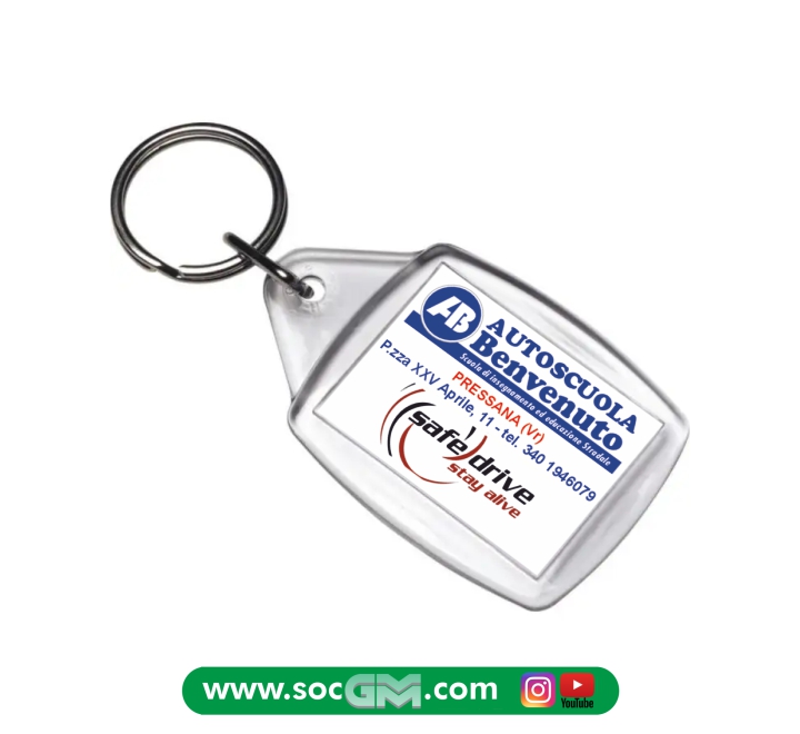 Portachiavi portafoto/logo trasparente. La stampa a colori sarà eseguita su un inserto in carta. Tempi di consegna:10 giorni data conferma bozze