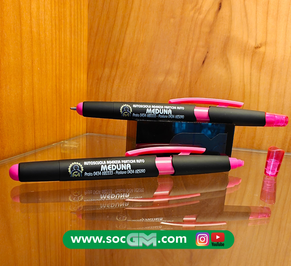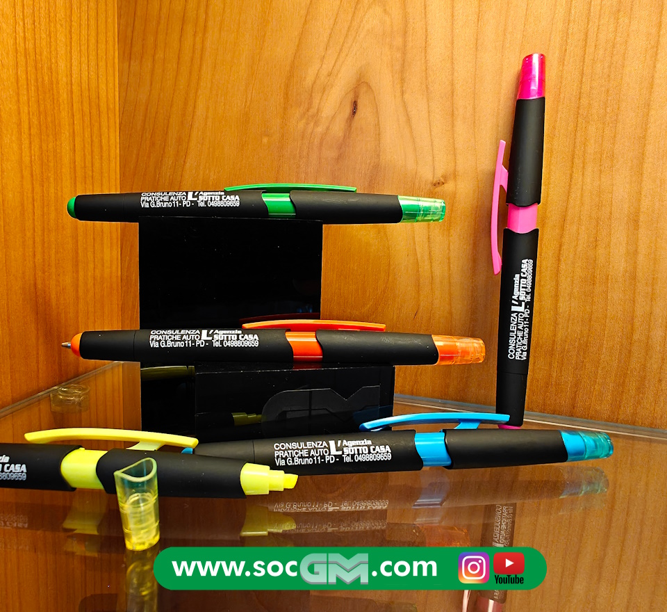 Penna a sfera con evidenziatore integratoper doppia funzione.