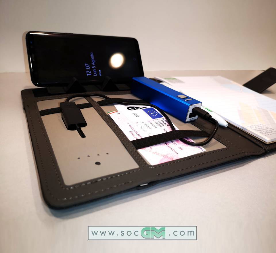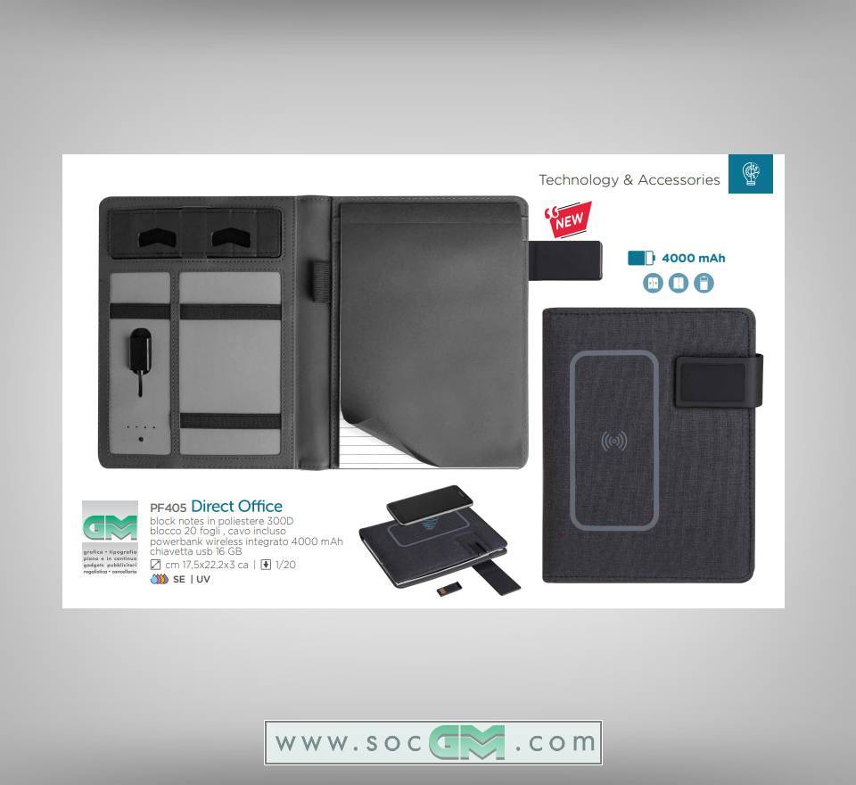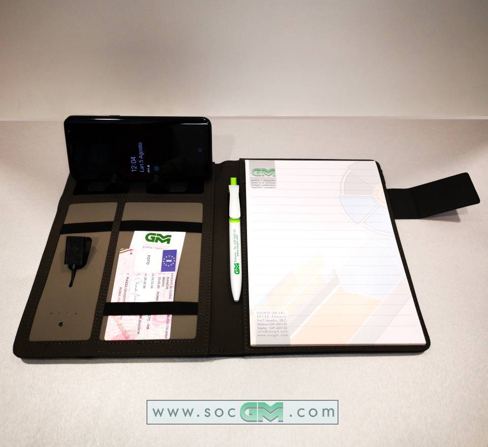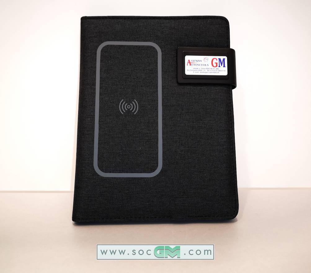 Portfolio per block notes in poliestere 300D, fornito di blocco, power bank incluso da 4.000 mAh, cavo incluso,chiavetta usb da 16 gb. Copertina con superficie abilitatat alla carica a induzione. Disponibile in piu' colori.