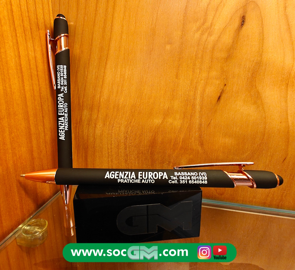 Penna a scatto in alluminiogommato con gommino pertouch screen, clip in metallo e finiture color golden rose.