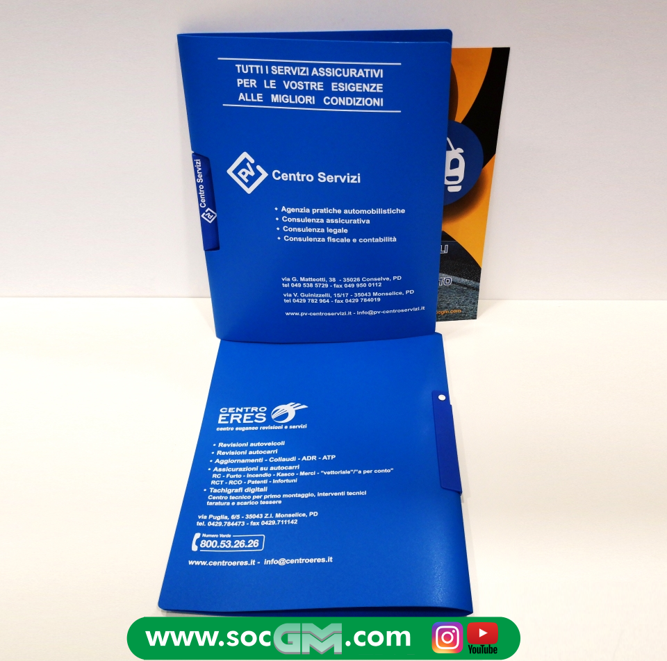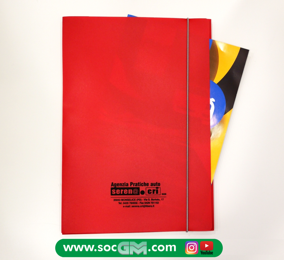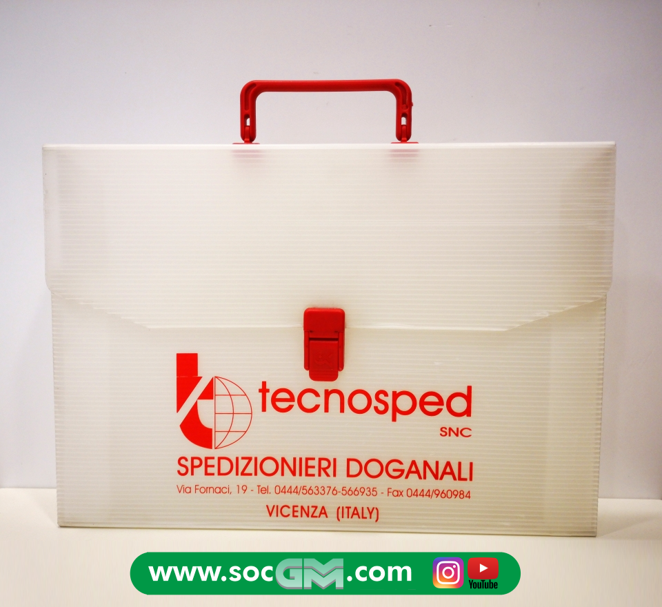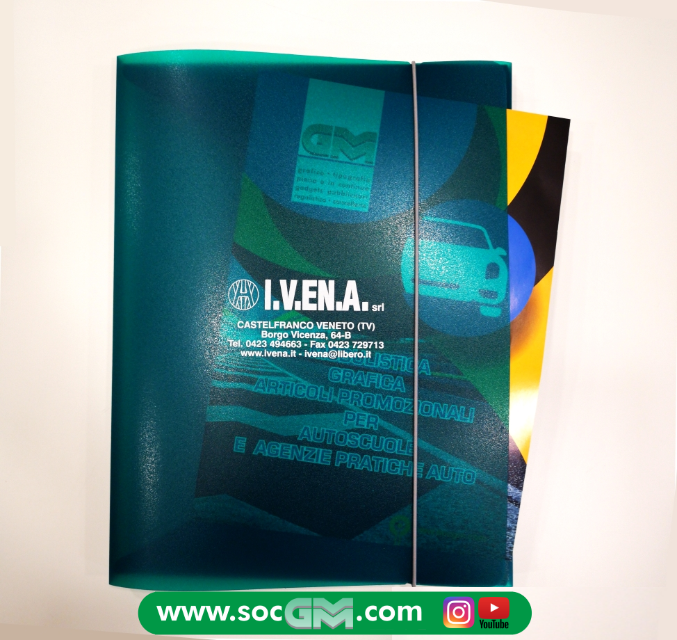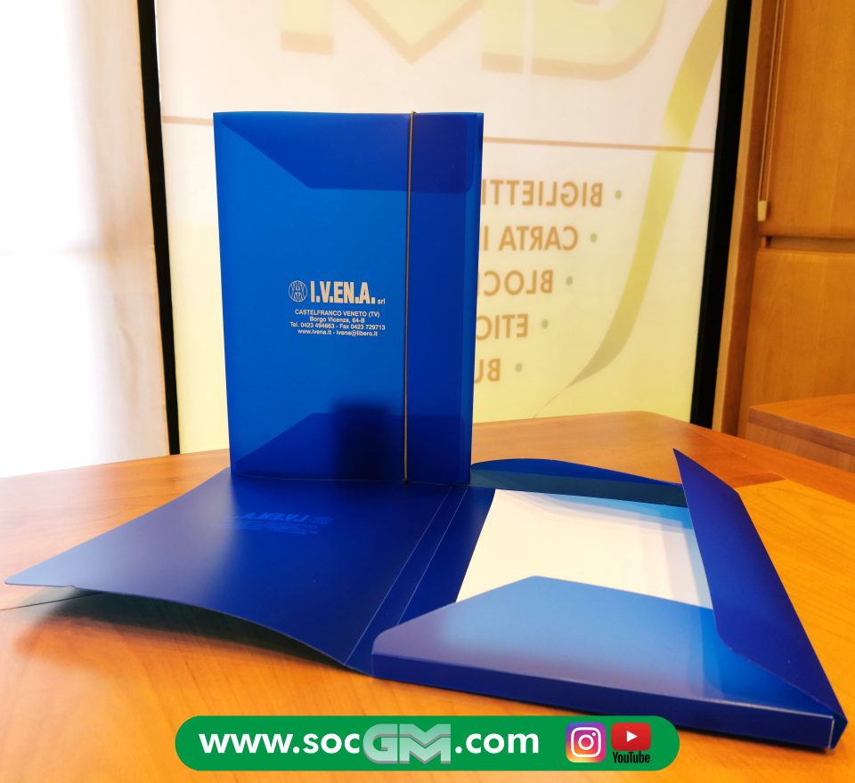 Cartelle a 3 lembi, in plastica con anelli ed elastico, portadocumenti, portadisegni o libri, con tracolla o maniglia, in diversi formati e vari colori, con personalizzazione a 1 o piu' colori serigrafici.