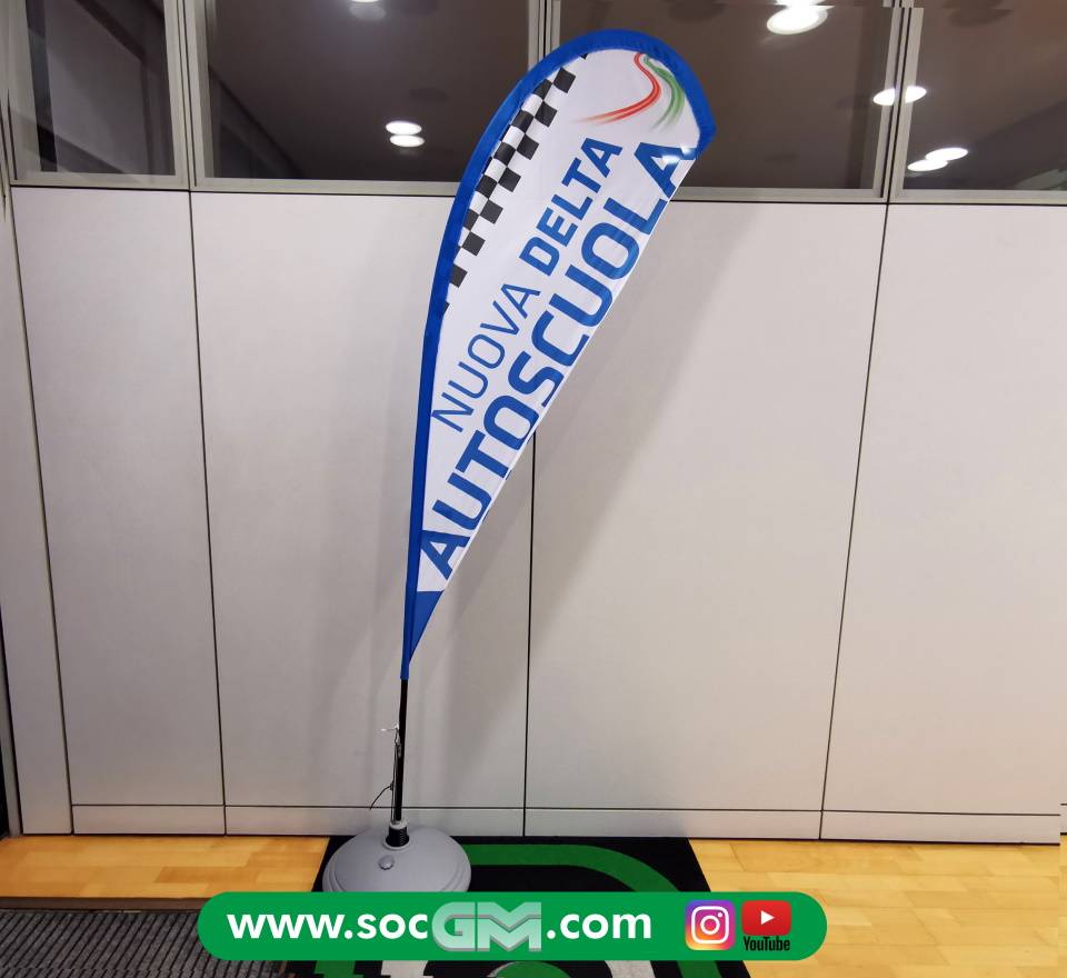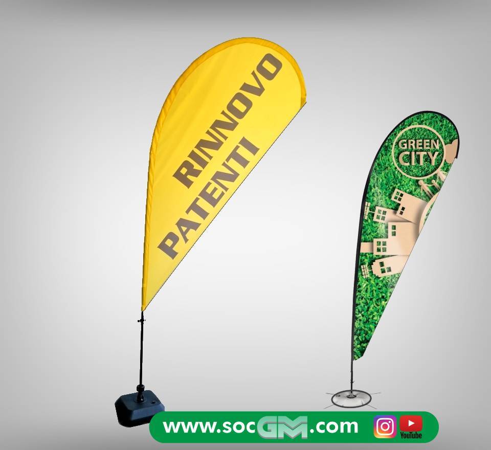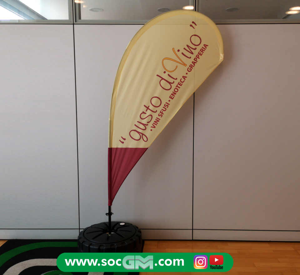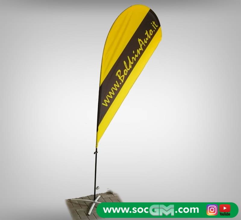 "Vela" in pvc leggero, monofacciale o bifacciale, personalizzata a colori, munita di base da interno o esterno. Diverse misure e altezze.