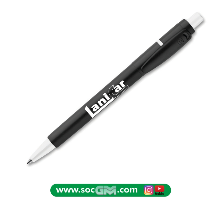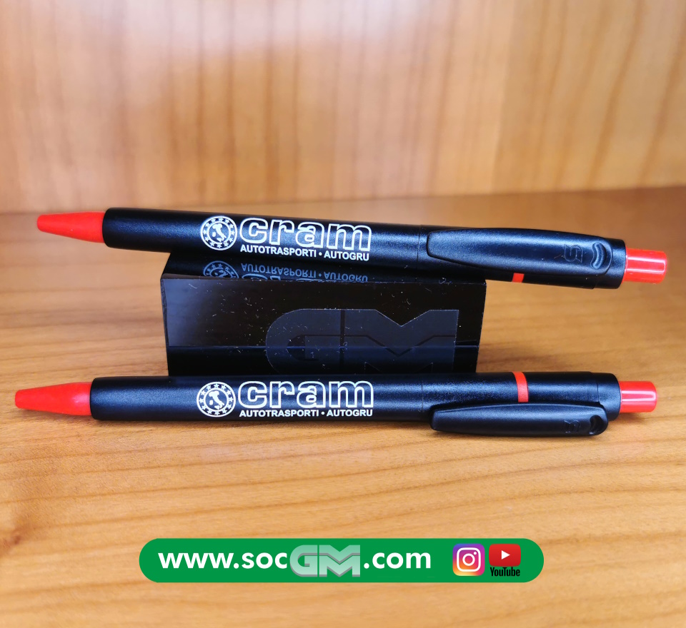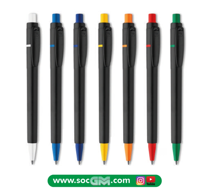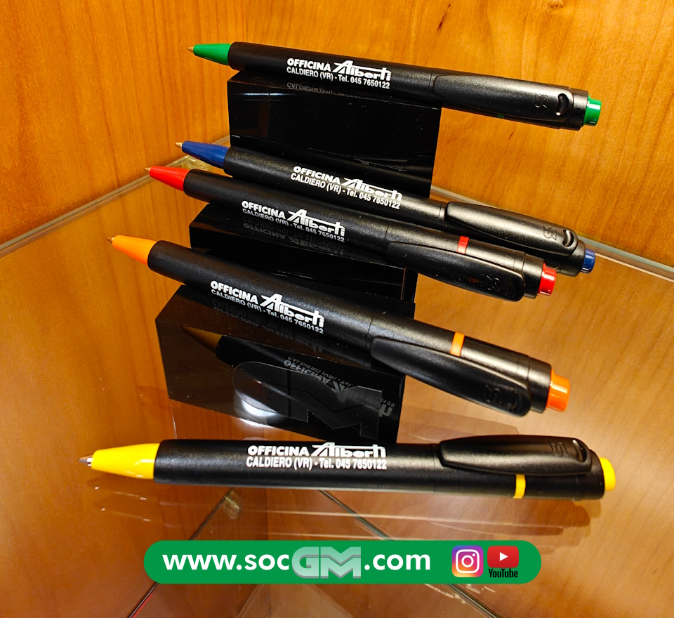 Testina-fermaglio e serbatoio di colore nero opaco.Pulsante, anelli e punta in colori assortiti.Inchiostro blucon personalizzazione bianca sul fusto