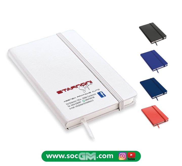 Quaderno A6 con copertina rigida soft touch e chiusura con elastico.