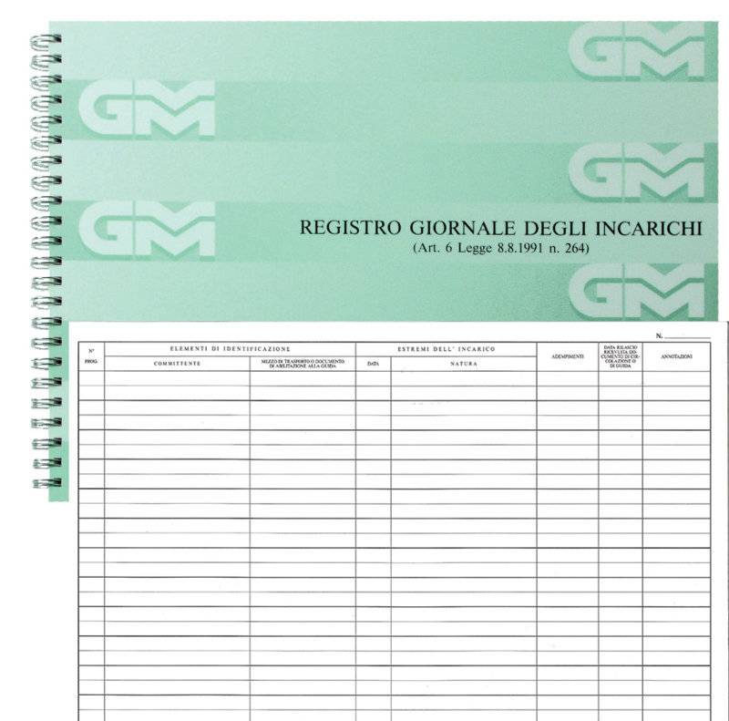 REGISTRO GIORNALE INCARICHI 100 fogli (200 facciate) e ogni facciata è composta da 16 righe. Rilegato con spirale.