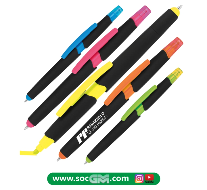 Penna a sfera con evidenziatore integratoper doppia funzione.