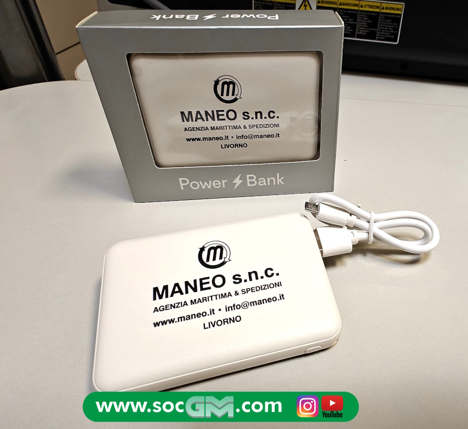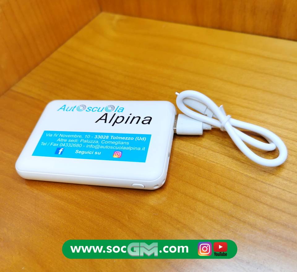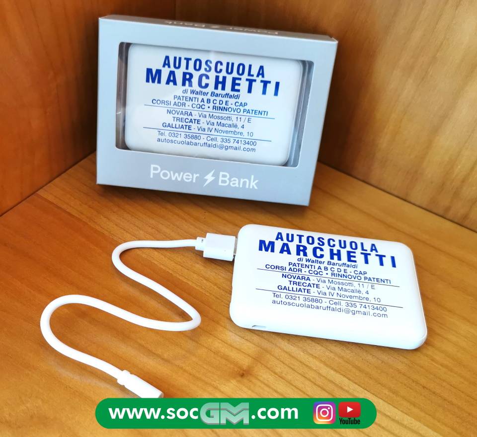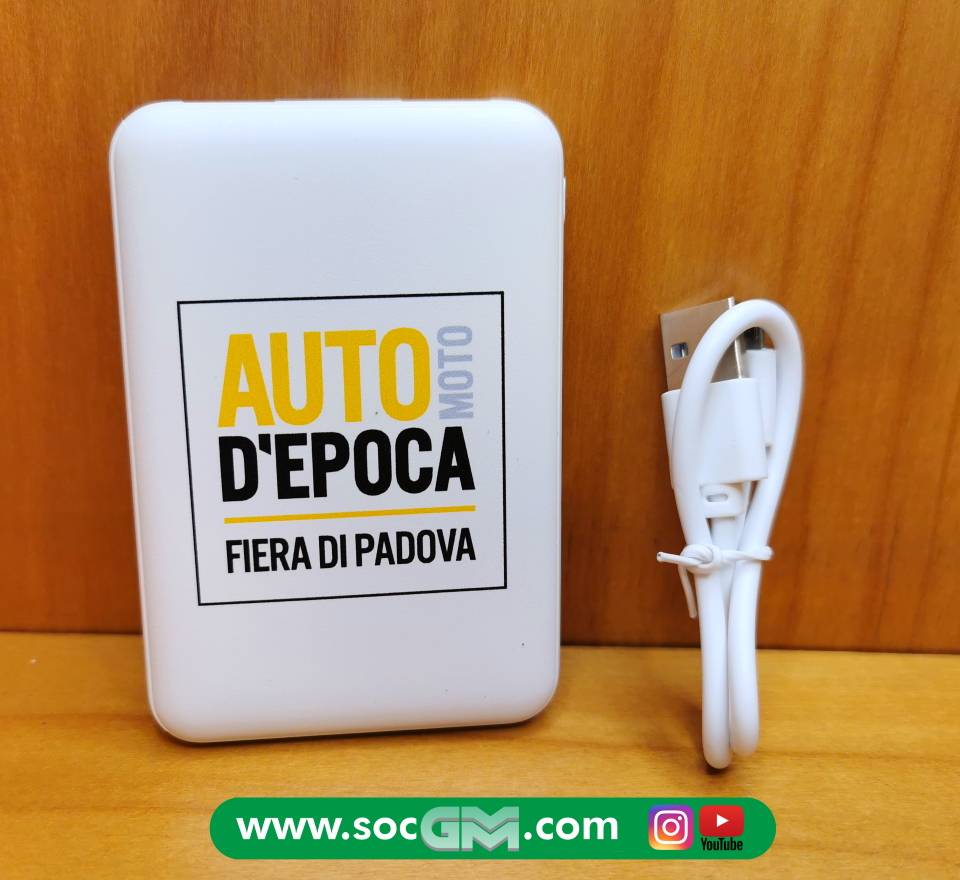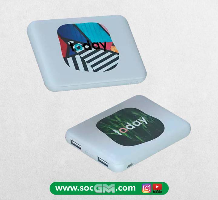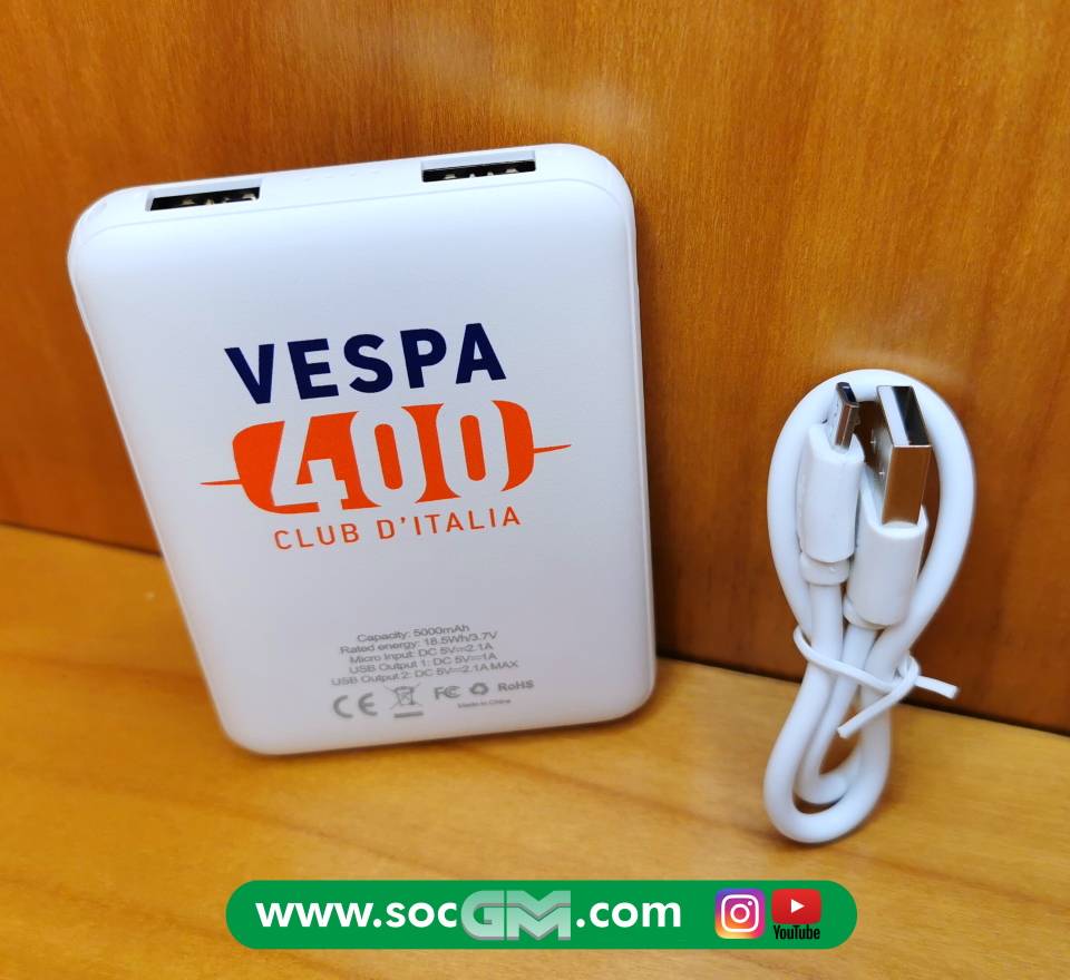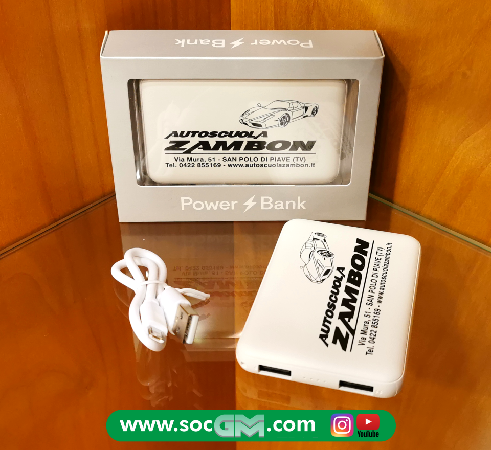 Power Bank con scocca in plastica, batteria da 5000 mAh e due porte USB, una con output da 5V/1A e l'altra da 5V/2.1 A.� La sua superficie misura circa la metà di quella di uno smartphone, e per questo è perfetto per essere portato in borsa o in tasca per la ricarica fuori casa.